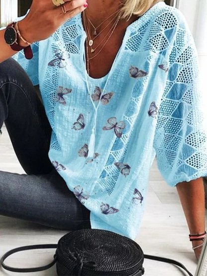 Women's V-neck Hollowed Out Butterfly Printed Casual Shirt